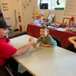 Awesome morning! After the kids said Hi! to Dove, the Harvest Kids rabbit, they crushed cans and then decided to do some arm wrestling before counting the change that had been donated.